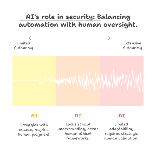 AI also can’t handle decisions involving legal implications, ethical tradeoffs, or multi-stakeholder responses. For instance, during a data breach, choosing whether to notify users, involve law enforcement, or preserve internal evidence requires legal insight, diplomacy, and strategic tradeoffs—none of which AI can simulate.