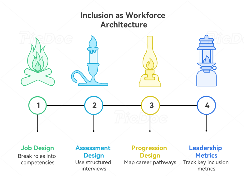 The most effective organizations over the next two years will stop treating diversity as a sourcing campaign and start treating inclusion as workforce architecture. That means redesigning the flow from awareness to hiring, from hiring to performance, and from performance to promotion.