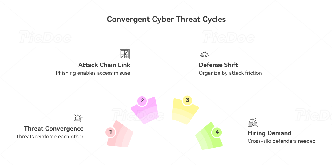 A phishing event may produce stolen credentials. Those credentials may unlock a cloud console, email system, or customer-support workflow. That access may then support fraud, lateral movement, data theft, or destructive disruption. Or a public-facing application flaw may provide initial access, which is then stabilized through privilege misuse or token abuse. In another case, a DDoS campaign may function as pressure, distraction, or customer-trust erosion while other attack paths are explored. The operational lesson is that defenders should stop organizing solely by tool domain and start organizing by attack-chain friction. IBM, Verizon, and ENISA are all pointing in that direction even when they use different language.