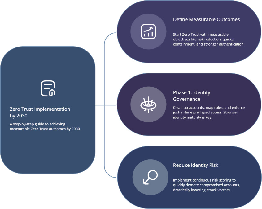 A Zero Trust roadmap fails when it starts with tools instead of control intent. Start with outcomes you can measure: reduced standing privileges, shorter access durations, stronger authentication for high risk actions, and faster containment when risk spikes. That outcome focus aligns with compliance pressure in Cybersecurity Compliance Trends Report 2025 and audit scrutiny in Future Cybersecurity Audit Practices. If you cannot measure progress, you cannot defend your program during scrutiny.
