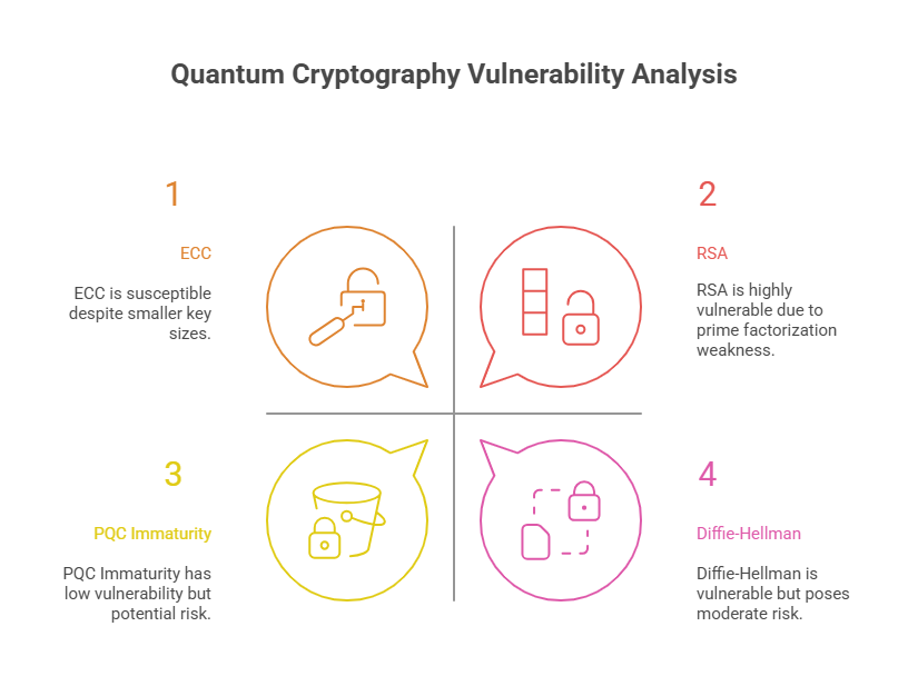Shor’s Algorithm, developed in 1994, is the quantum equivalent of a wrecking ball to public-key encryption. A sufficiently powerful quantum computer—estimated to require around 4000 error-corrected qubits—could factor the keys protecting everything from financial systems to medical records in minutes. ECC, often seen as a faster alternative to RSA, is even more vulnerable under quantum attack vectors due to its smaller key sizes.